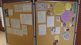 Verschiedene Tagebucheinträge aus den Klassen wurden zusammen mit dem Material des Anne-Frank-Hauses auf Stellwänden collagiert, um sie zum Anne-Frank-Tag am 12. Juni 2023 auszustellen. Die Arbeit der Schüler*innen informiert und mahnt und erinnert uns alle, damit wir nicht vergessen. Interessierte Schüler*innen aus anderen Klassen und Kursen besuchen die Ausstellung im Rahmen des Gesellschaftslehre- oder Geschichtsunterricht, oder sie halten während ihrer Pause an den Stellwänden inne, um schweigend zu lesen.
