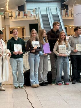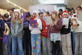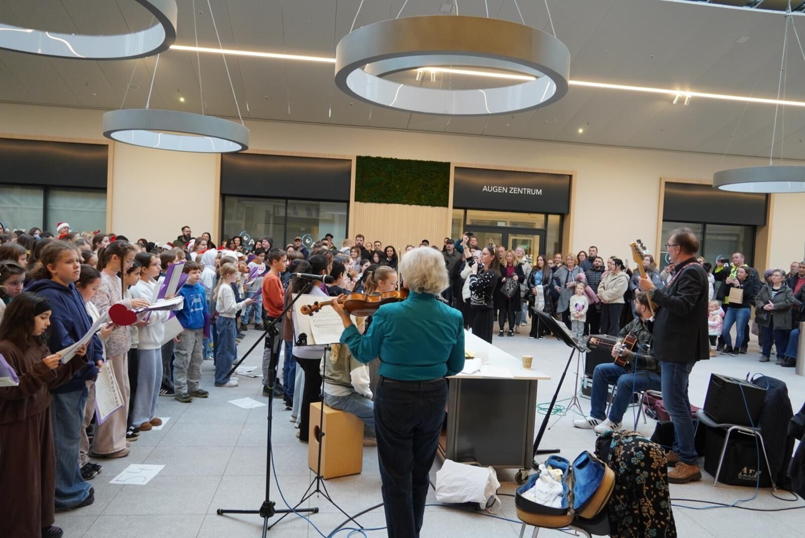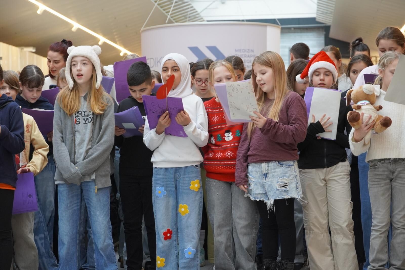 Im Publikum standen Eltern, Freunde, Familie, und alle, die sich von der guten Stimmung anstecken ließen. Aber auch unsere Oberstufe wollte ein Zeichen setzen und hatte Grußbotschaften mit gemalten Bildern der Unterstufe zum Jüdischen Lichterfest Chanukka vorbereitet, die sie mit dem Publikum teilten. Es sollte eine besinnliche Stunde für alle Kulturen und Religionen in Mülheim werden, die gemeinsam gefeiert wurde.
